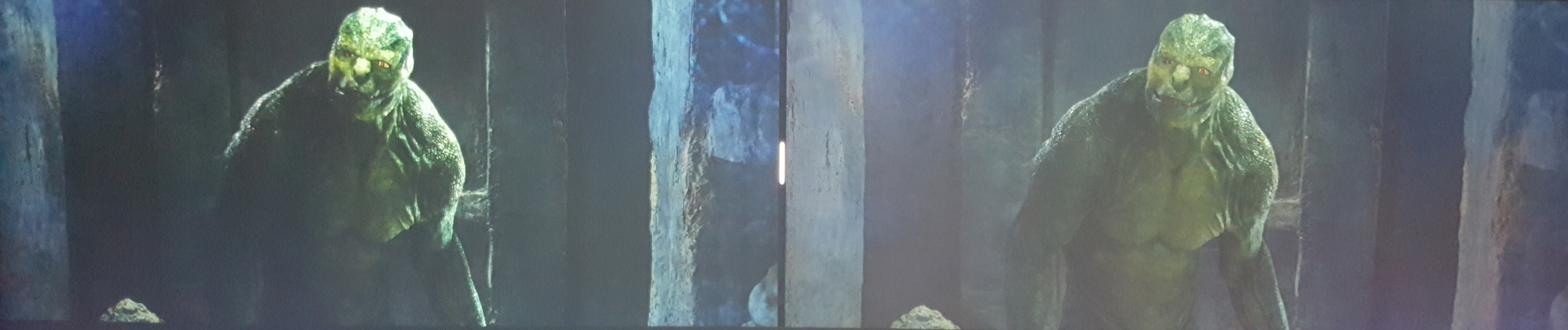 "Человек-паук: нет пути домой" (около 46 минуты). На моей картинке справа как покажет hdr с 540 нит яркостью. С 300 и ниже ничего видно не будет, туловище ящера не будет видно. (слева в sdr, справа в hdr). Контент любой вообще одинаково будет темным, если яркости мало.