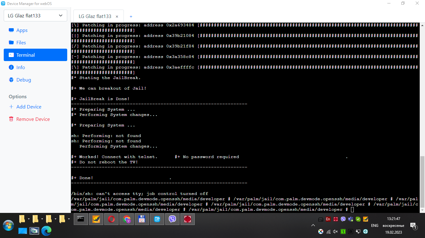 После этого перезагружаем ТВ полностью - лучше всего на несколько секунд вытащить вилку шнура питания. - Снова открываем Terminal в Dev Manager, вводим по одной команде: