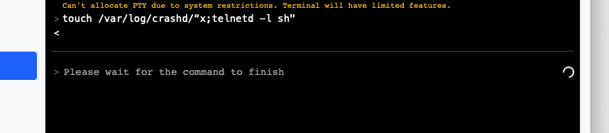 По опыту получения рута с другого форума при вводе команды touch /var/log/crashd/"x;telnetd -l sh" необходимо обращать внимание на формат кавычек. Некоторые используют неправильные кавычки из Microsoft Word после чего терминал "уходит в себя" и команда не работает.