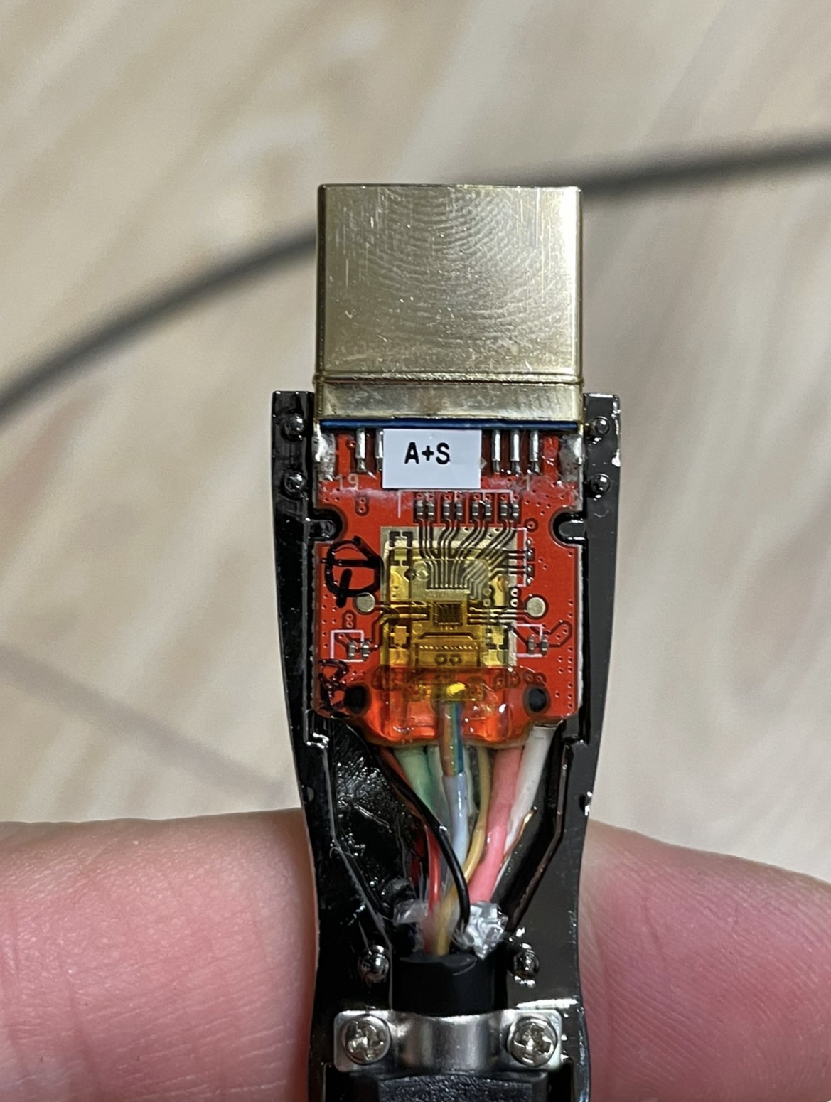 Фотки «проблемной» в моём контексте использования оптики и толстой меди приложил. В прошлом году, когда прошлый кабель выбрасывал, я вскрывал штекер «поглядеть». Сейчас нашел фотки - никакого термоинтерфейса от чипа к корпусу там нет, так что моя теория не безосновательна.