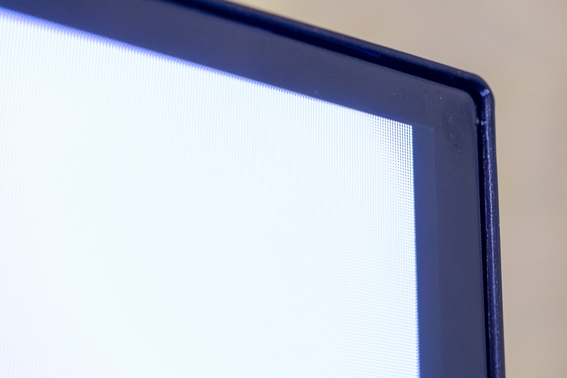 Пластиковый корпус немного выпирает, что в некоторых случаях может защитить дисплей от физического контакта. Поверхность экрана глянцевая — для уменьшения бликов рекомендуется снять плёнку с экрана, которая по всем признакам является транспортировочной. На ней изначально множество царапин, другое дело, что поддеть плёнку может быть непросто — ярлычок отсутствует, но мне довольно быстро удалось подцепить её ногтем в левом нижнем углу. Производитель, судя по информации на форумах, тоже рекомендует снять плёнку.