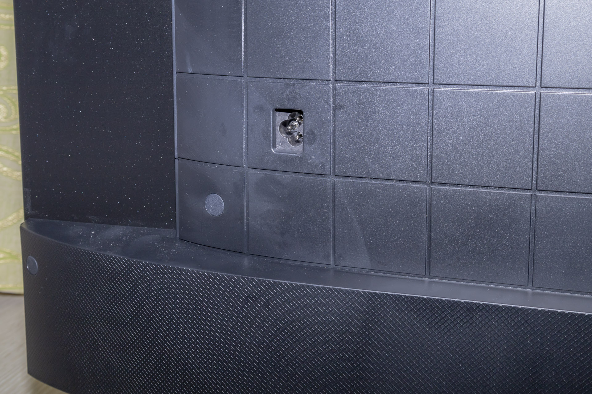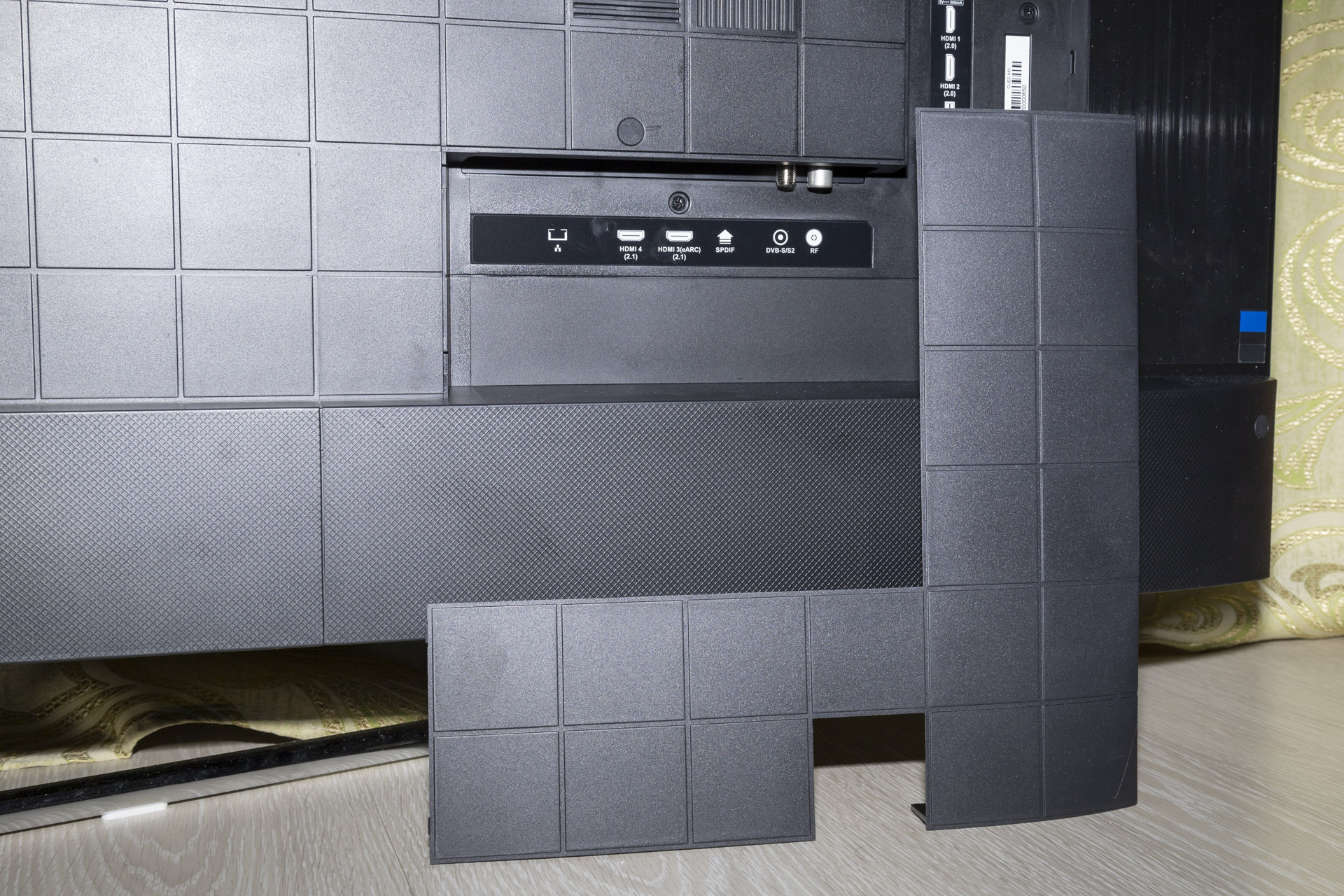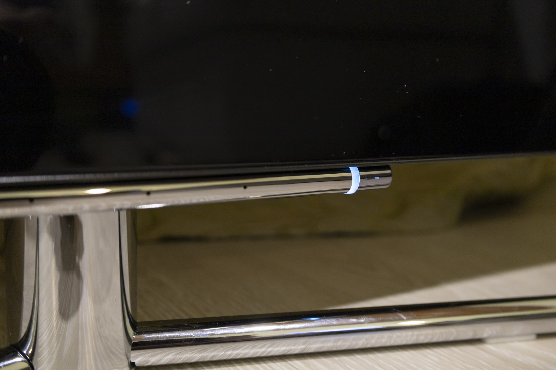 Снизу расположены два динамика суммарной мощностью 30 Вт и серебристая вставка по центру с ИК-приёмником и боковой кнопкой питания. Путём однократного нажатия кнопки при работающем телевизоре удаётся попасть в меню для регулировки звука, переключения каналов и выбора входов. Выключение устройства возможно через длительное зажатие. Что касается качества звука, то высокие частоты почти отсутствуют, но громкости для небольших помещений хватает, и нетребовательных пользователей такой вариант вполне может устроить. Есть поддержки Dolby Atmos.