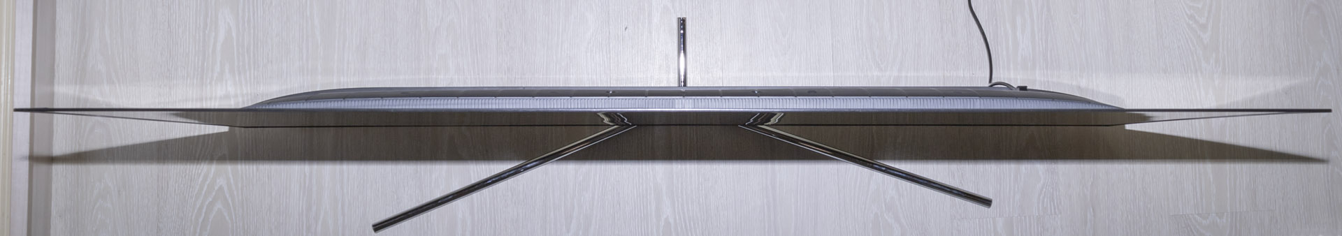 Верхняя часть телевизора очень тонкая — примерно 4.3 мм с учётом выпирающей рамки, что стало возможным благодаря использованию матрицы OLED. При этом тонкие телевизоры более хрупкие, что нужно учитывать при использовании и перемещении. Блок с электроникой и разъёмами в нижней части задней стороны гораздо более толстый, но иначе и быть не может. Основным материалом корпуса стал матовый пластик — при первом использовании вы наверняка почувствуете исходящий от него неприятный запах, который быстро выветривается. Вероятно даже пахнет не сам корпус, а защитные плёнки, поэтому их лучше сразу снять.