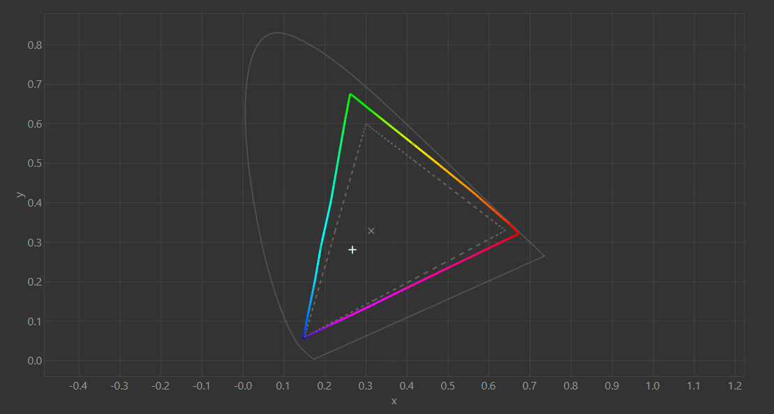 Во втором случае цветовой охват дисплея близок к охвату DCI-P3 — точнее покрывает его на 92.7%. Максимальная яркость белого цвета меняется в зависимости от выставленного профиля изображения и того, насколько процентов заполнен экран белым полем. Если при использовании софта DisplayHDR test tool и включенного HDR на небольшом участке белого поля удаётся получить яркость до 666 кд/м?, то при полностью белом экране значение уменьшается до 173 кд/м?, либо до 315 кд/м? без HDR. При заполнении экрана на 10, 25 или 50% белым цветом яркость без HDR составляет чуть более 427 кд/м?. Минимальная яркость на белом экране без HDR – 42 кд/м?.