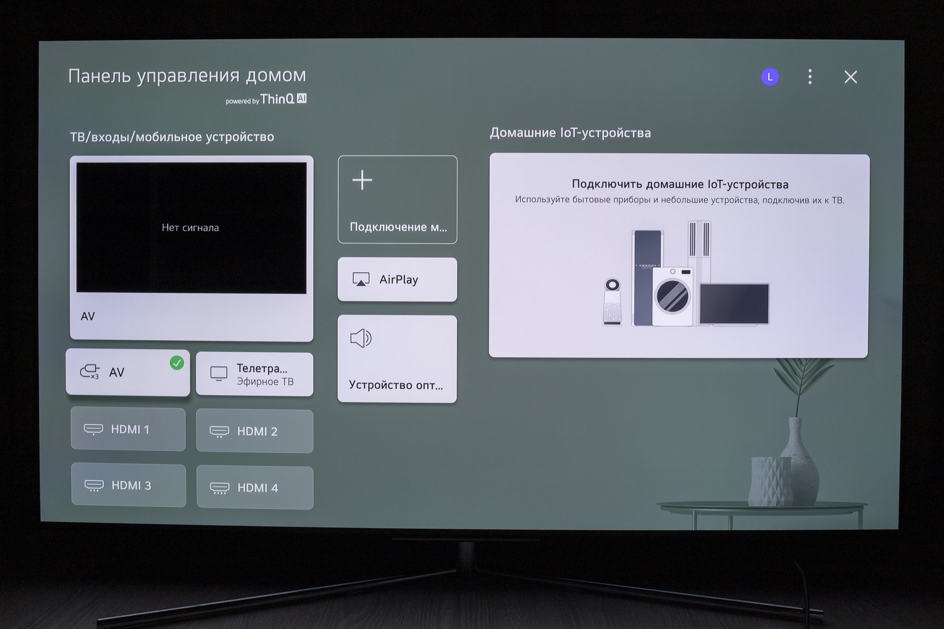 Другая полезная функция — полноценное управление телевизором через смартфон с установленным приложением LG ThinQ. При таком способе управления курсор мышки на экране перемещается нажатием на сенсорный экран.