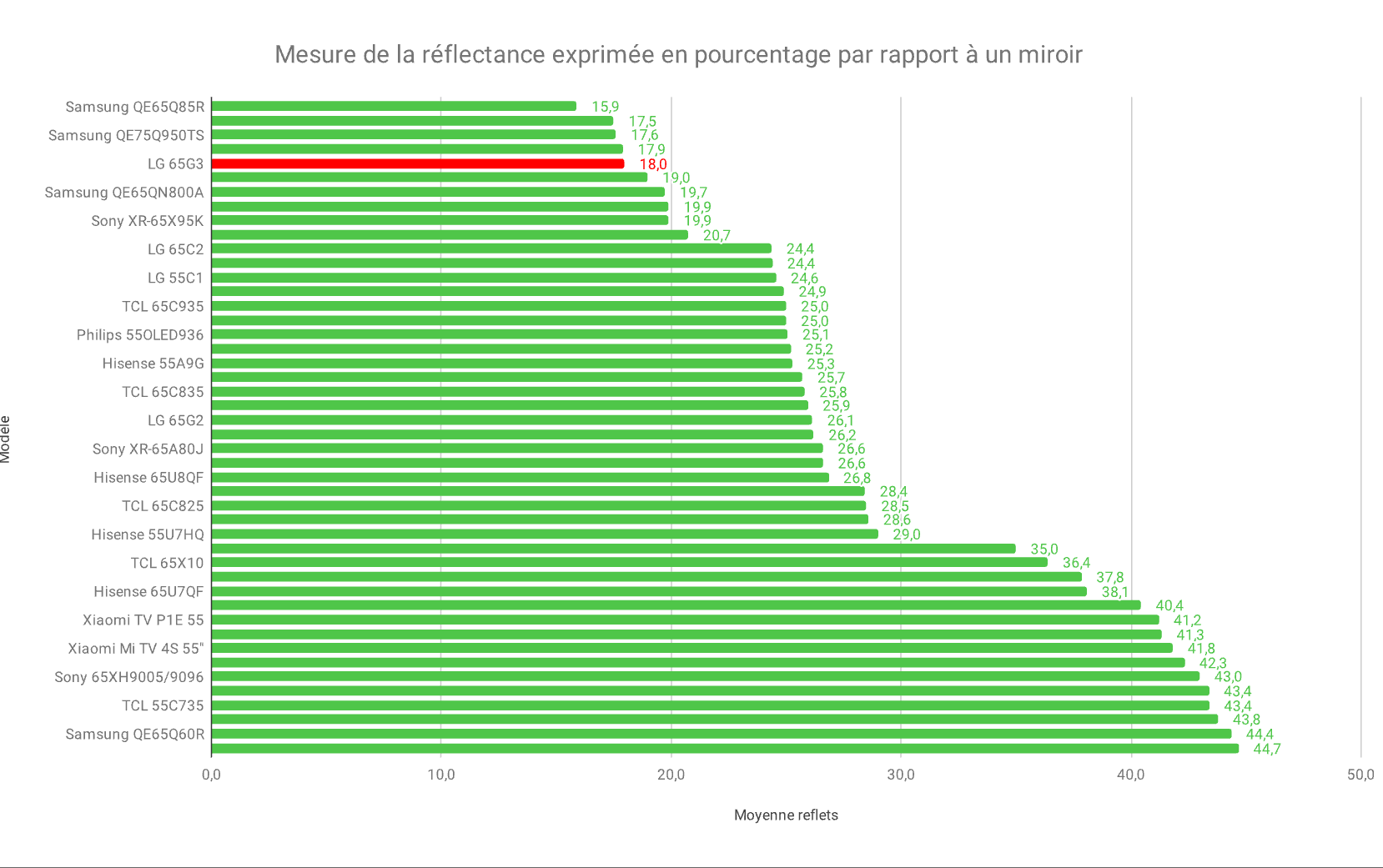 С белым цветом, откалиброванным на 150 кд / м2, LG Oled 65G3 потребляет всего 71 Вт на нашем тестовом объективе, что является относительным потреблением всего 61 Вт / м2. Прошлогодний LG 65G2 потреблял 82 Вт (70,4 Вт / м2), что свидетельствует о том, что фильтр микролинз значительно повышает эффективность плиты. Таким образом, он обеспечивает эквивалентную яркость с меньшим потреблением энергии. При таком низком потреблении телевизор уступает по мощности телевизорам с самым низким энергопотреблением на рынке, таким как Samsung QE65Q60B (47,2 Вт / м2). Потребление в режиме ожидания, со своей стороны, всегда ниже 1 Вт.