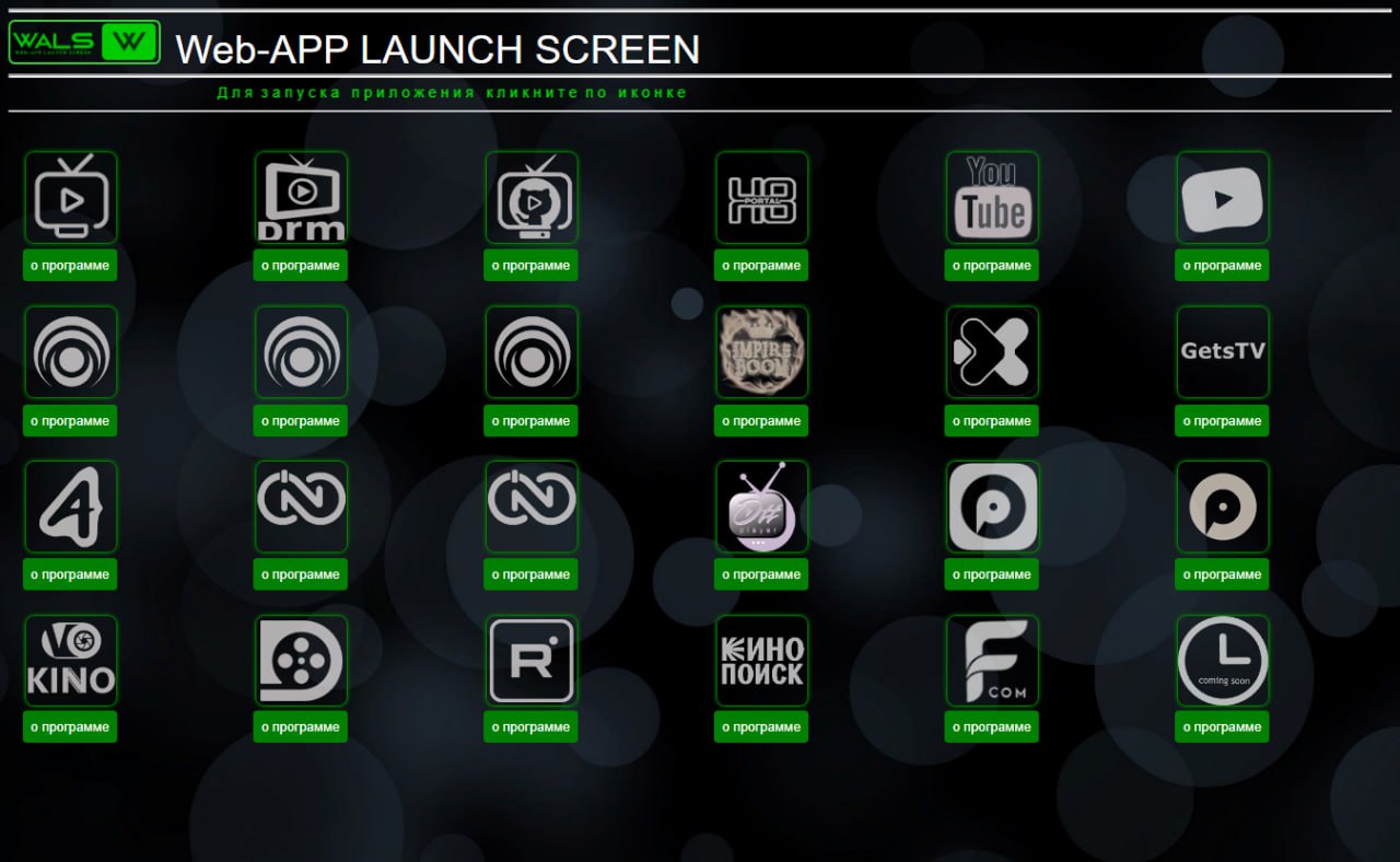 WALS-msx (Web App Launch Screen) это медиапортал MSX с подборкой популярных приложений для смарт тв. Для использования прописать в "Start parametr": wals09.github.io Так же можно добавить как плейлист MSX через лаунчер.
