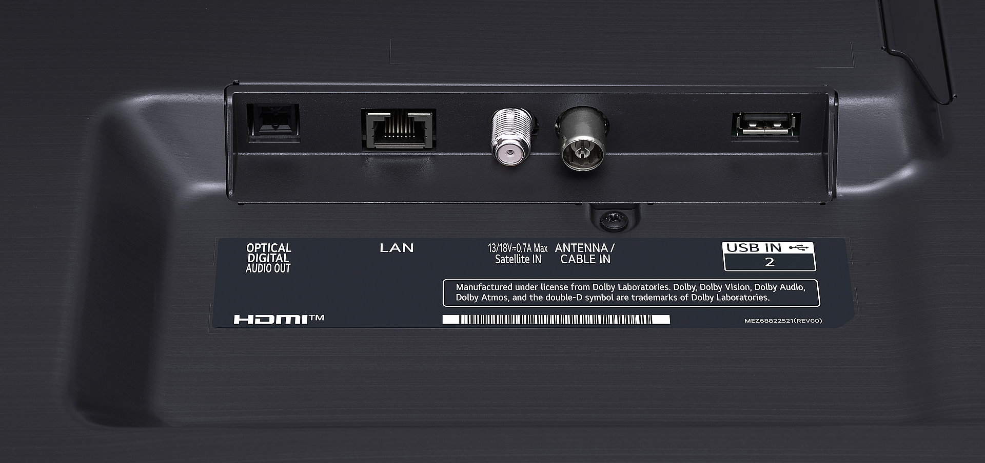 Задняя панель телевизора LG NANO82 оснащена следующими интерфейсами: 2 антенных входа (для спутникового и кабельного/эфирного ТВ), компонентный AV-вход (в версии для США), один порт LAN (со скоростью 100 Мбит/сек), один порт USB (версии 2.0). Что касается аудио, то на этой же панели расположен только оптический аудиовыход, выход 3,5" для наушников отсутствует.
