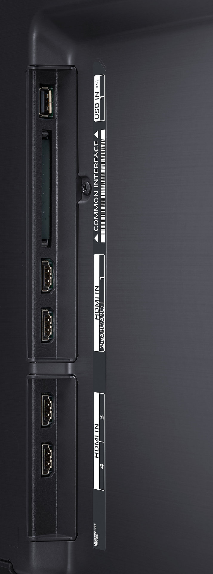 Боковая панель оснащена четырьмя входами HDMI v2.0 (один из которых совместим с ARC и и eARC), одним разъемом USB 2.0 и слотом условного доступа CI+. Кроме того на борту имеются встроенные беспроводные модули Wi-Fi (с поддержкой стандартов 802.11a, 802.11b, 802.11g, 802.11n, 802.11n 5 ГГц, 802.11ac, Wi-Fi Direct) и Bluetooth (поддерживается сопряжение с совместимыми устройствами по протоколу Bluetooth 5.0).