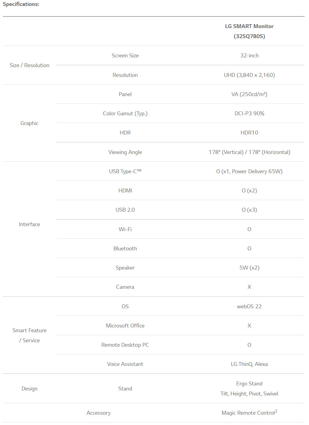 LG Smart Monitor 32SQ780S заключён в белый корпус и оснащён 32-дюймовым LCD-экраном с разрешением 3840?2160 пикселей (4K), частотой обновления 60 Гц и обладает 90% охватом цветовой гаммы DCI-P3. Монитор поставляется с подставкой LG Ergo, обладающей регулируемым креплением. Поддерживается возможность настроить нужную высоту, расстояние, а также вертикальную либо горизонтальную ориентацию.