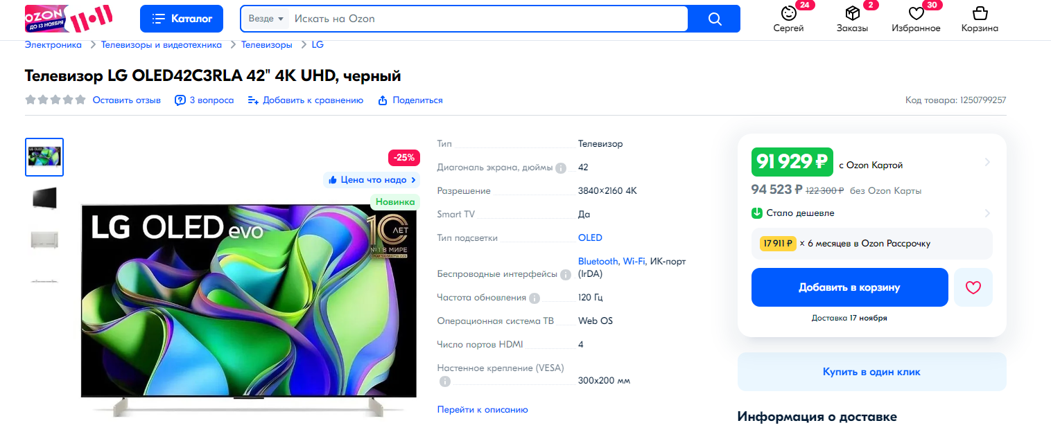 gps @ Телевизор LG OLED C3 (42,48,55,65,77,83") 2023 годаgps писал(а):На озоне появилась вменяемая цена на 42 диагональ- 104 тыс... бесплатная доставка в регионы. Заказал, жду.