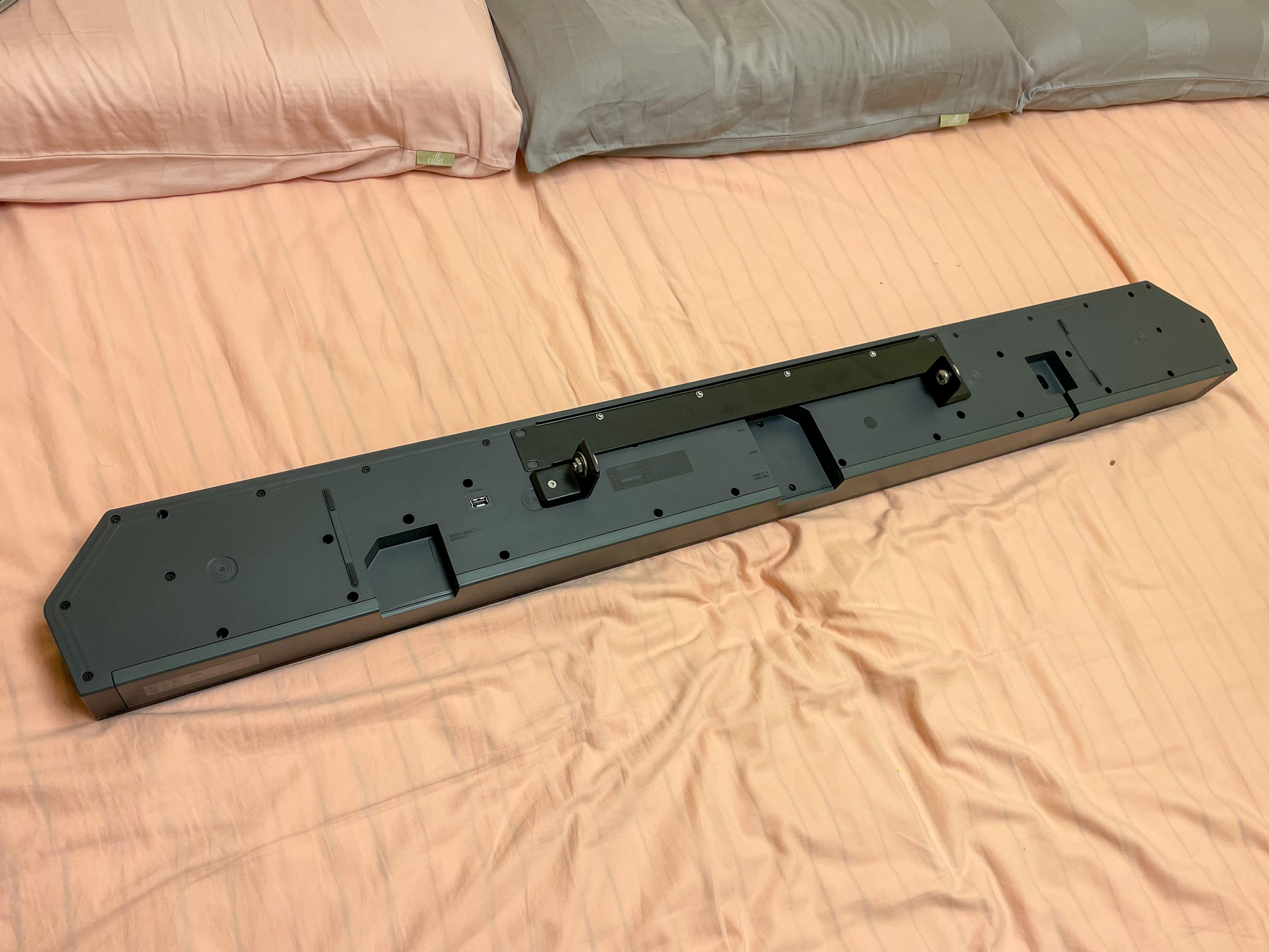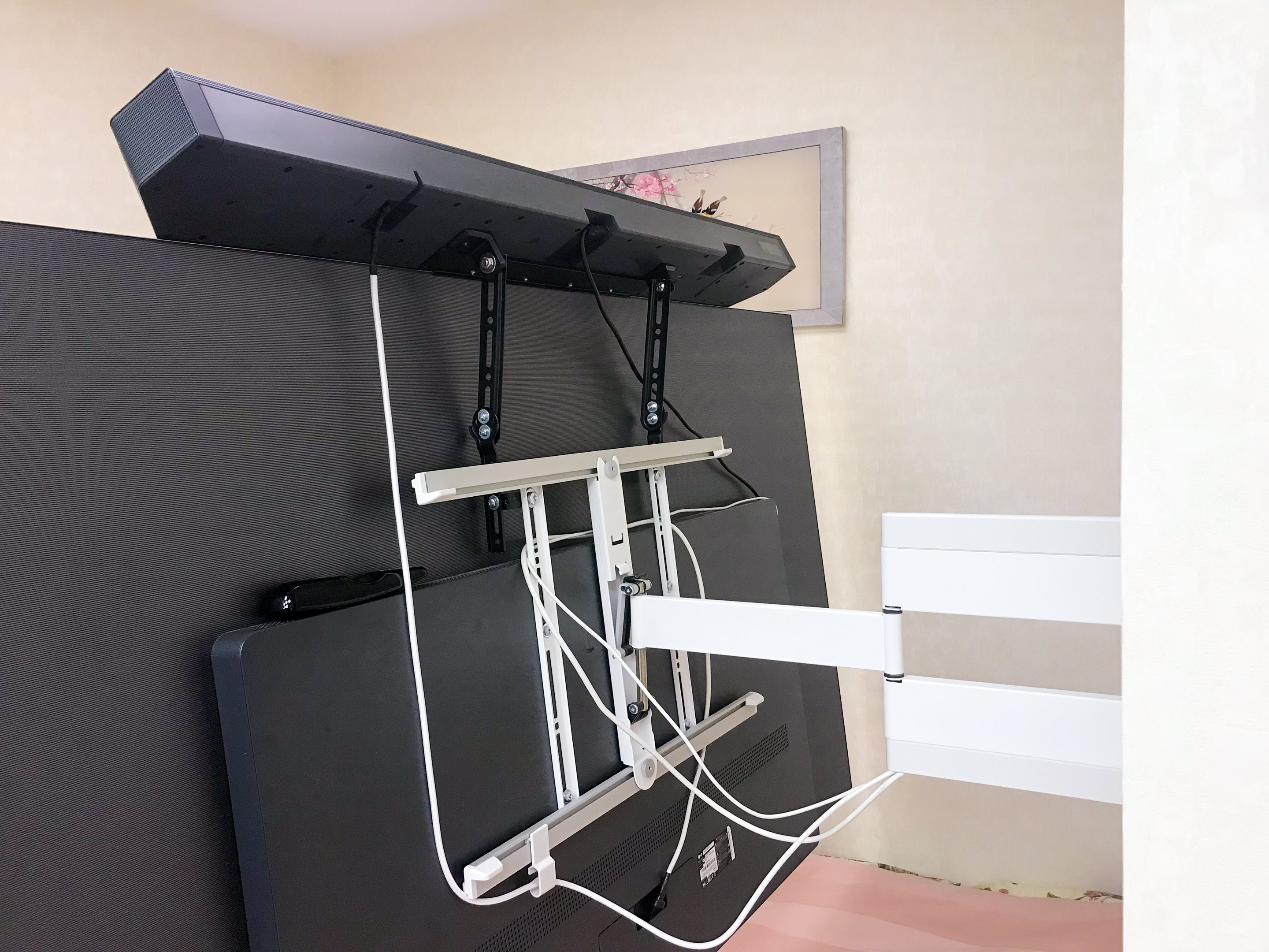 Я вначале думал поднять телик чуть выше и повесить саундбар снизу. Технически, в этом не было никакой проблемы. Но после покупки, когда я стал искать крепления для саундбара, обнаружил, что многие вешают саундбар сверху и мне эта идея очень понравилось: с одной стороны саундбар не будет мешаться под ногами и не будет необходимости поднимать телик выше (чего мне очень не хотелось). С другой стороны, неожиданно, это позволит починить разбалансировку телика: у моего 77C2 основная масса телика находиться внизу, в результате чего практически не работает возможность вертикального наклона телика (возможность Vogels THIN 545): наклон просто не держится. А после установки саундбара сверху, баланс массы был починен и телик стало возможно легко наклонять вниз. Последнему факту я был несказанно рад.