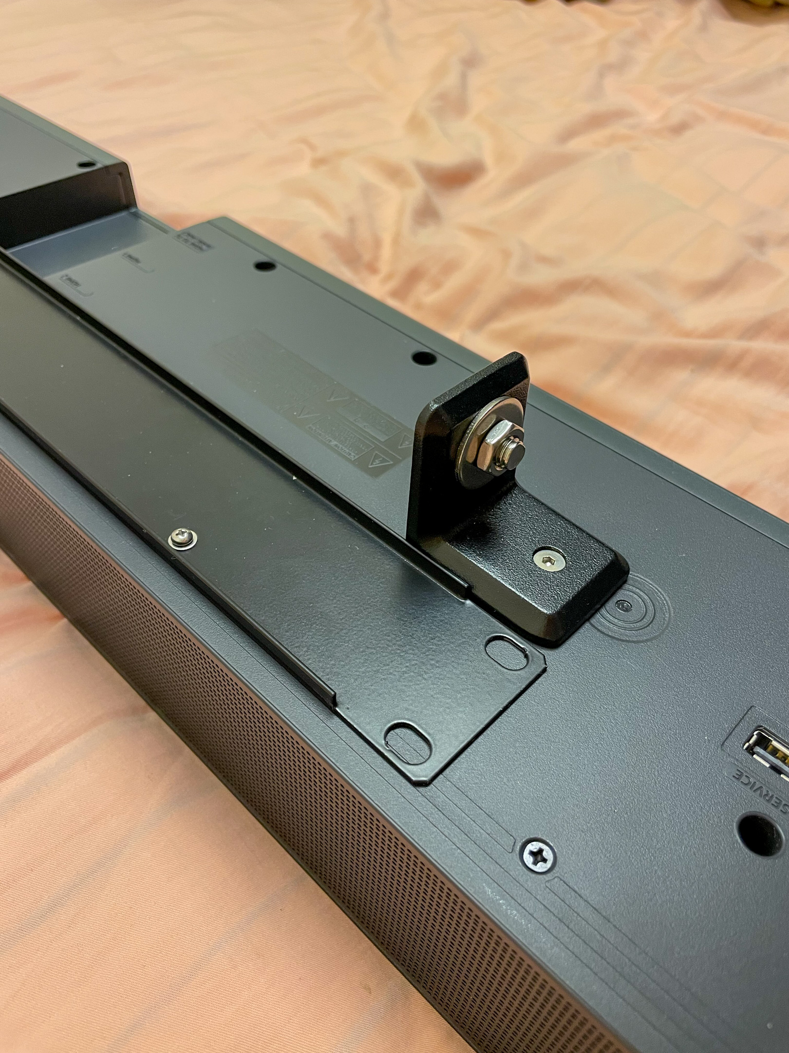 Стальные уголки и крепление саундбара чуток подпилил по размерам, кое-где рассверлил дырок или наделал новых, использовал подвернувшийся под року крепеж. Это все позволило мне расположить саундбар сверху телевизора почти "заподлицо" с экраном и установить нужный в моих условиях угол наклона вниз. Конструкция вышла довольно устойчивой.