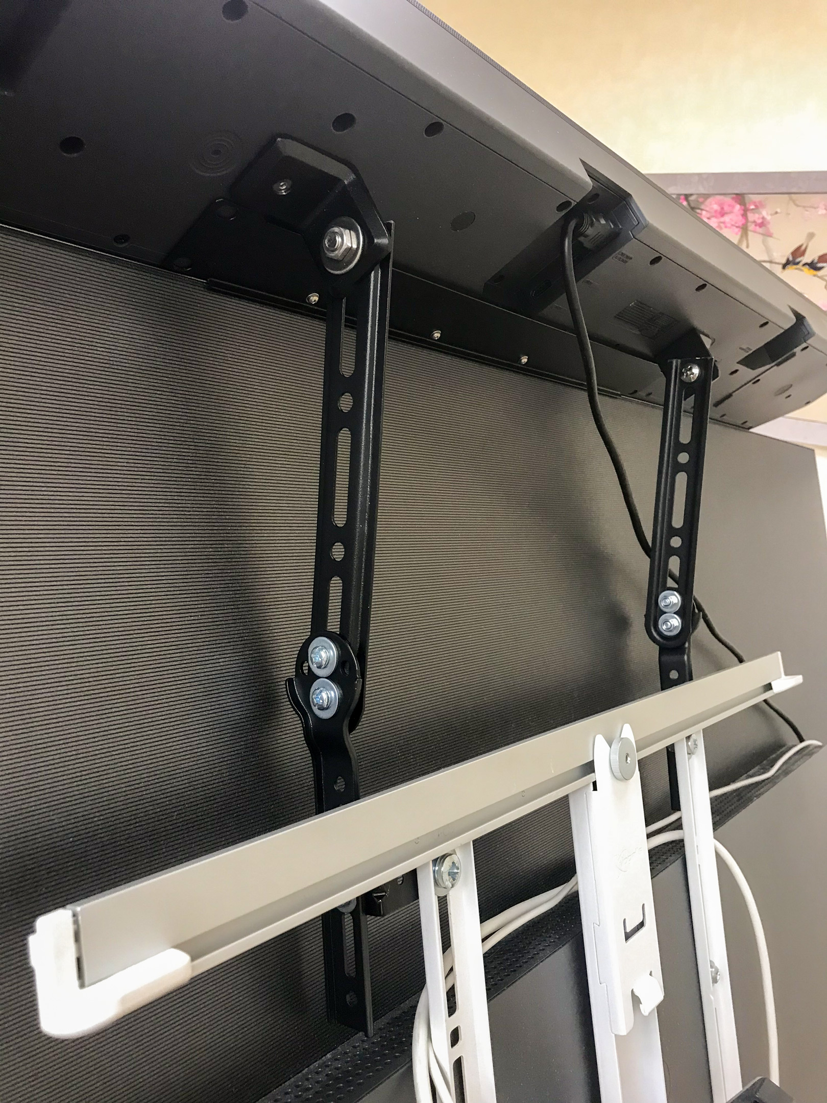Кронштейн для саундбара Ultramounts UM504. Я в начале с его помощью, примерно как было описано в инструкции, прикрепился к L-образному родному креплению саундбара к стене, а сами L-образные уголки положил на верх экрана. Несколько дней посмотрел, что вышло, и мне это не понравилось: саундбар выпирал на половину за плоскость телика вперед и был направлен строго прямо. При этом, уши слушателей обычно расположены заметно ниже и вполне заметно чувствовалось снижение громкости.