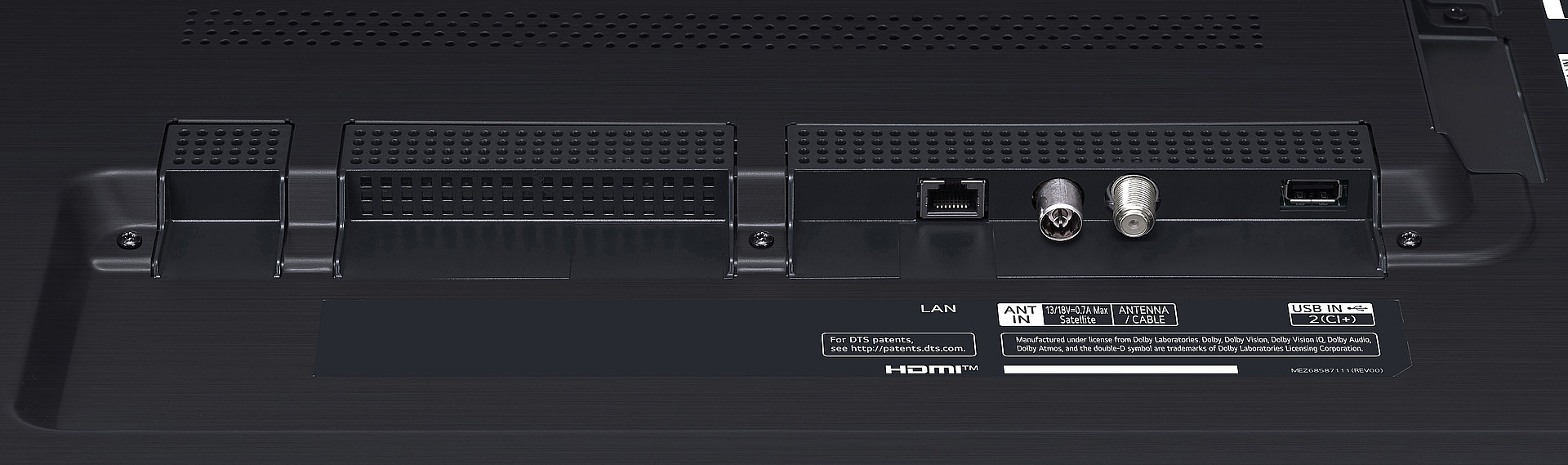 Нижняя панель модели LG 86QNED81 оснащена следующими интерфейсами: 2 антенных входа (для спутникового и кабельного/эфирного ТВ), один порт LAN (со скоростью 100 Мбит/сек), один порт USB (версии 2.0).