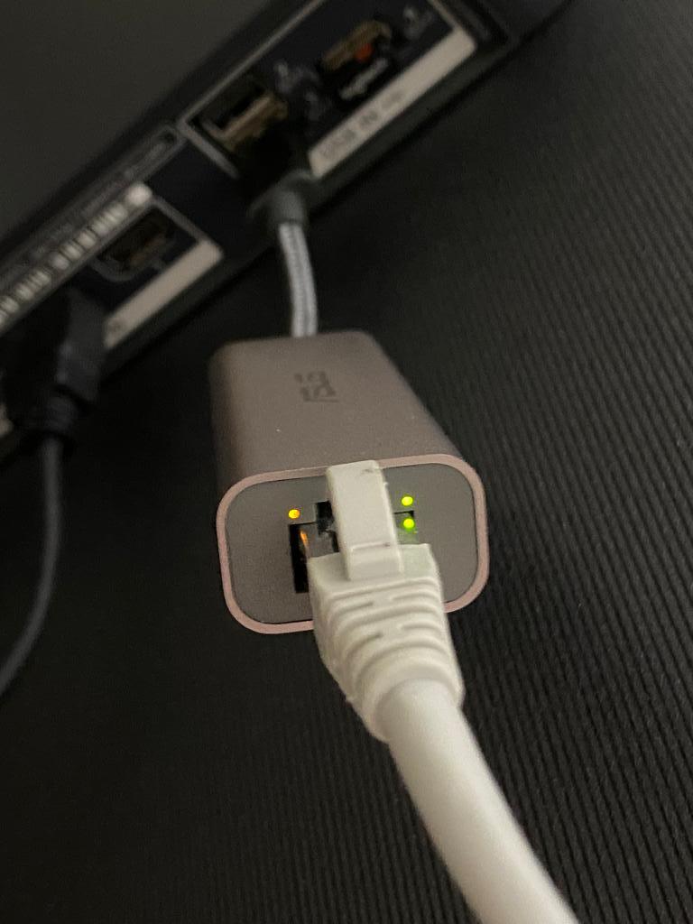 Немного разочаровал, т.к. рассчитывал на подключение к сети на скорости 2.5 Gbps, но не вышло. Внутре у него чип Realtek, телевизор распознает адаптер, как и все остальные, с которыми может работать – никак об этом не сообщая. Но поднять линк на 2.5 Gbps не может, только на 1 Gbps (левый LED при 2.5 Gbps должен гореть зеленым). В компьютере все нормально, а на телевизоре вот так
