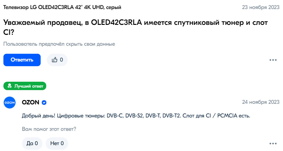 JackSparrow писал(а):gps писал(а):Сейчас внимательно поизучал характеристики OLED42C3RLA 42" 4K UHD, серый, продавец казахстан озон, и прифигел, в их варианте действительно отсутствует спутниковый тюнер и слот CI вот такое попадалово, кому нужен спутник. Будте внимательны при покупке... Теперь понятно, почему и цена такая, 97 тыс у него... Не зря я переживал, когда свой покупал... Но мне повезло. Вот ссылка на кастрированную модель, может кому то поможет сделать выбор. Тут вопрос еще в том что не все продавцы будут такое афишировать. https://www.ozon.ru/product/televizor-l ... 258548780/