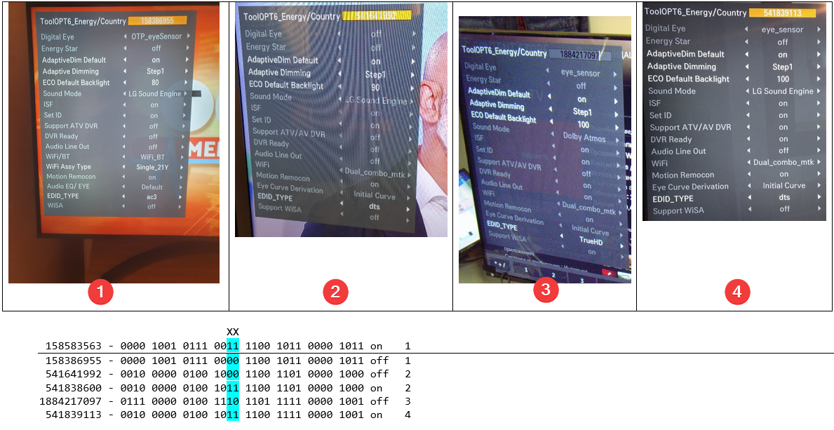 In previous answers and on my TV I have same "ToolOPT6_Energe/Country" menu and these two bits works for me.