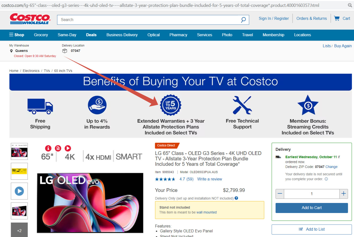 LG 4K UHD OLED-телевизор G3 65 дюймов - пакет Allstate с 3-летним планом защиты, включающий 5 лет общего покрытия