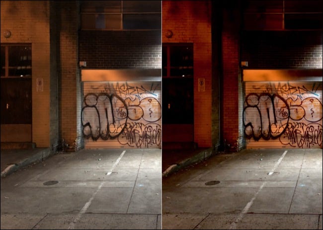 Вы можете не сразу заметить "подавление" черного цвета, пока не увидите "правильное" изображение, отображаемое рядом с ним (например, на другом дисплее, который был правильно откалиброван). Вы можете увидеть смоделированный пример на изображении ниже, где правая сторона теряет детали в кирпичах под тенью. Другими словами, это изображение "подавленного черного" (black crush).