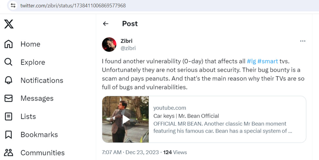 https://twitter.com/zibri/status/1738411006869577968Я нашел еще одну уязвимость (0-day), которая затрагивает все телевизоры LG Smart.
