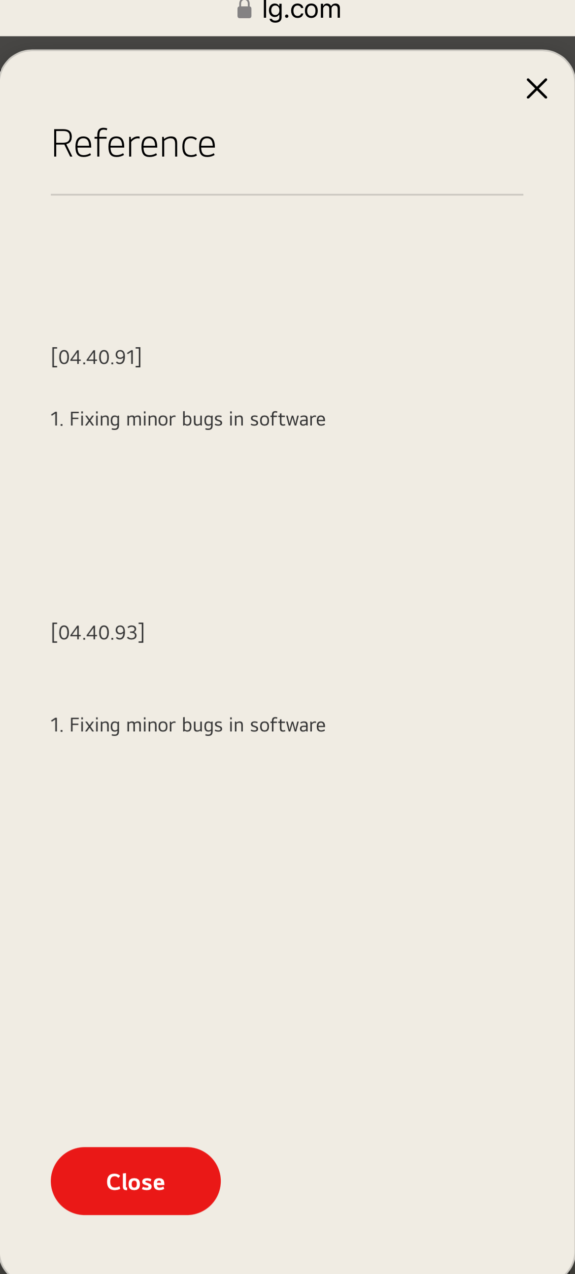 У LG своя логика, отличная от пользовательской. В 95% случаев это всего лишь "мелкие исправления ошибок" или "обновления безопасности". Все текущие обновления прошивки для серии с 2022 года всегда включают в себя часть подготовки к обновлению webOS23. С этой точки зрения, я бы установил обновление, даже если оно не принесет никаких объяснимых или видимых изменений.