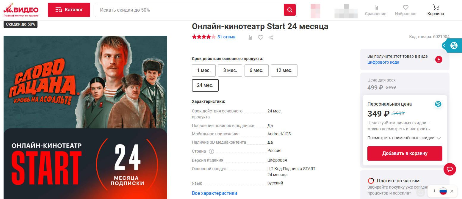 Тоже обратил внимание, что сейчас подписка онлайн-кинотеатр Start на 24 месяца как в Мвидео (https://www.mvideo.ru/products/onlain-k ... ca-6021904), так и в Эльдорадо (https://www.eldorado.ru/cat/detail/onla ... -mesyatsa/) доступна по супер-цене 499 ? (якобы, вместо 5999 ?).