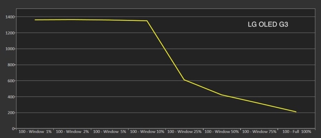 Яркость HDR OLED G3: хорошие 1400 нит для основных моментов снижаются примерно до 206 при 100% белом цвете.