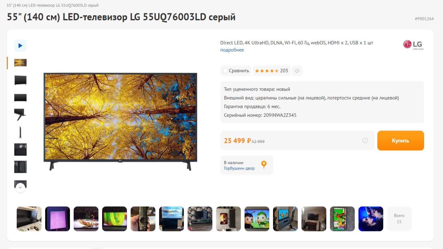 На маркетплейсах. Чуть менее надежный способ: гарантийные телевизоры здесь встречаются гораздо реже. Однако на маркетплейсах более широкий ассортимент и большие скидки, так что вероятность найти нужную модель по хорошей цене выше.