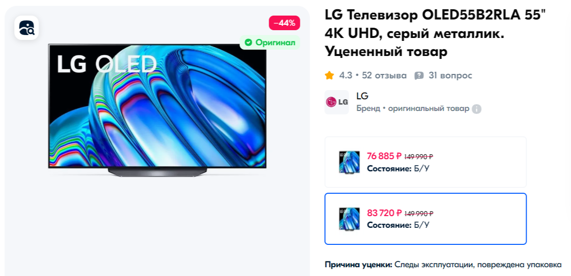 Найти раздел подержанных товаров на сайте несложно: ищите в каталоге "уцененные" или "уцененные товары" (у DNS и Citilink точно есть такие разделы). Износ телевизора варьируются от продавца к продавцу, но есть две основные категории: