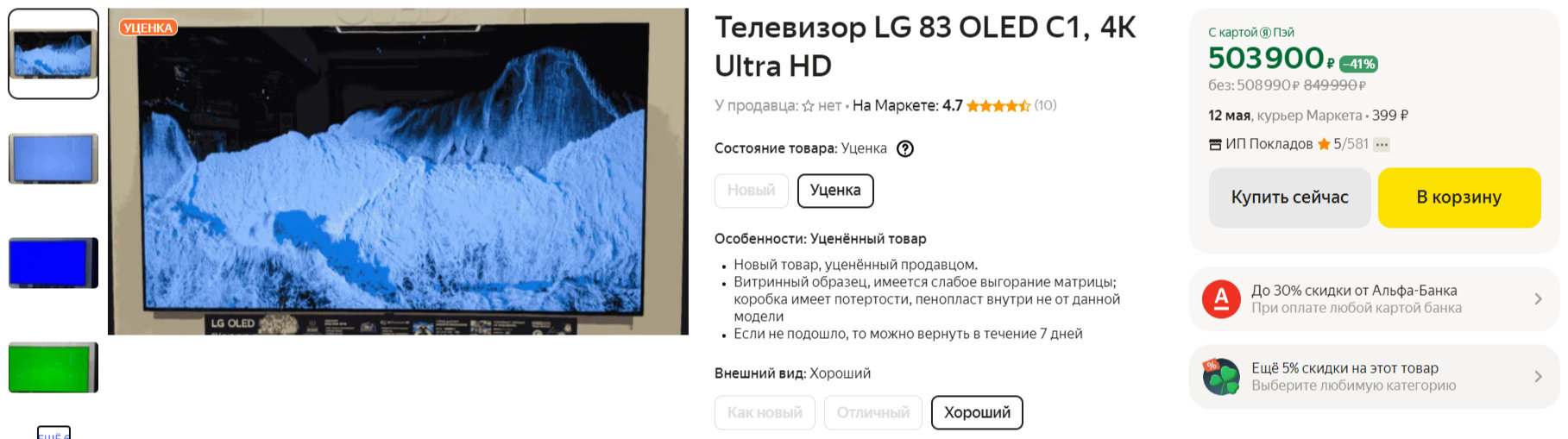 На маркетплейсах. Чуть менее надежный способ: гарантийные телевизоры здесь встречаются гораздо реже. Однако на маркетплейсах более широкий ассортимент и большие скидки, так что вероятность найти нужную модель по хорошей цене выше.
