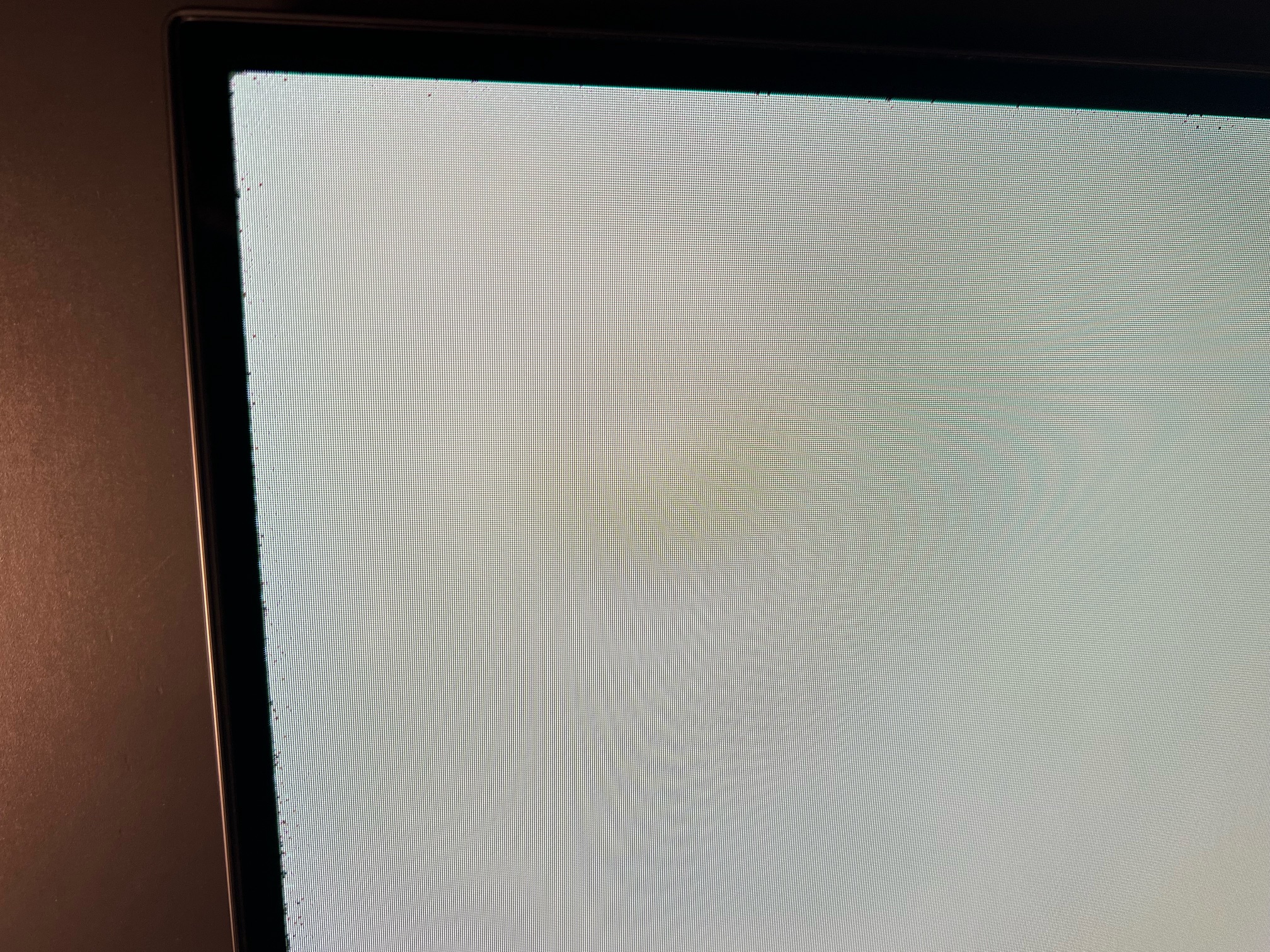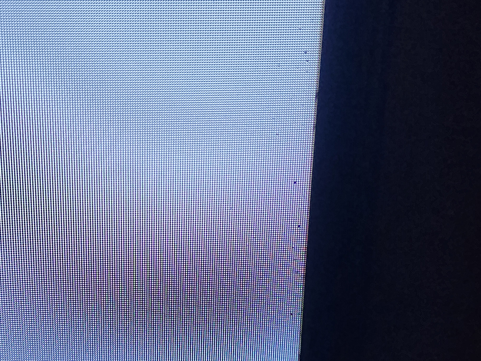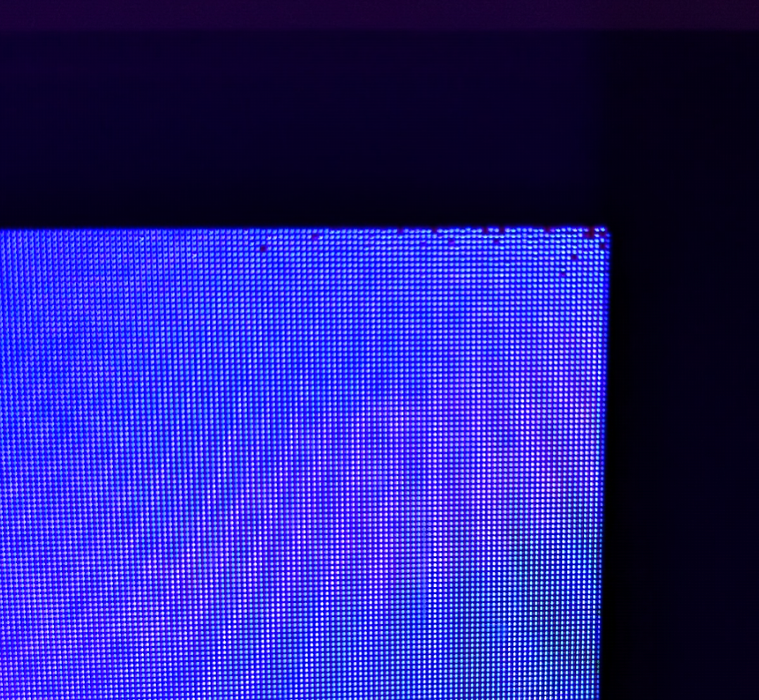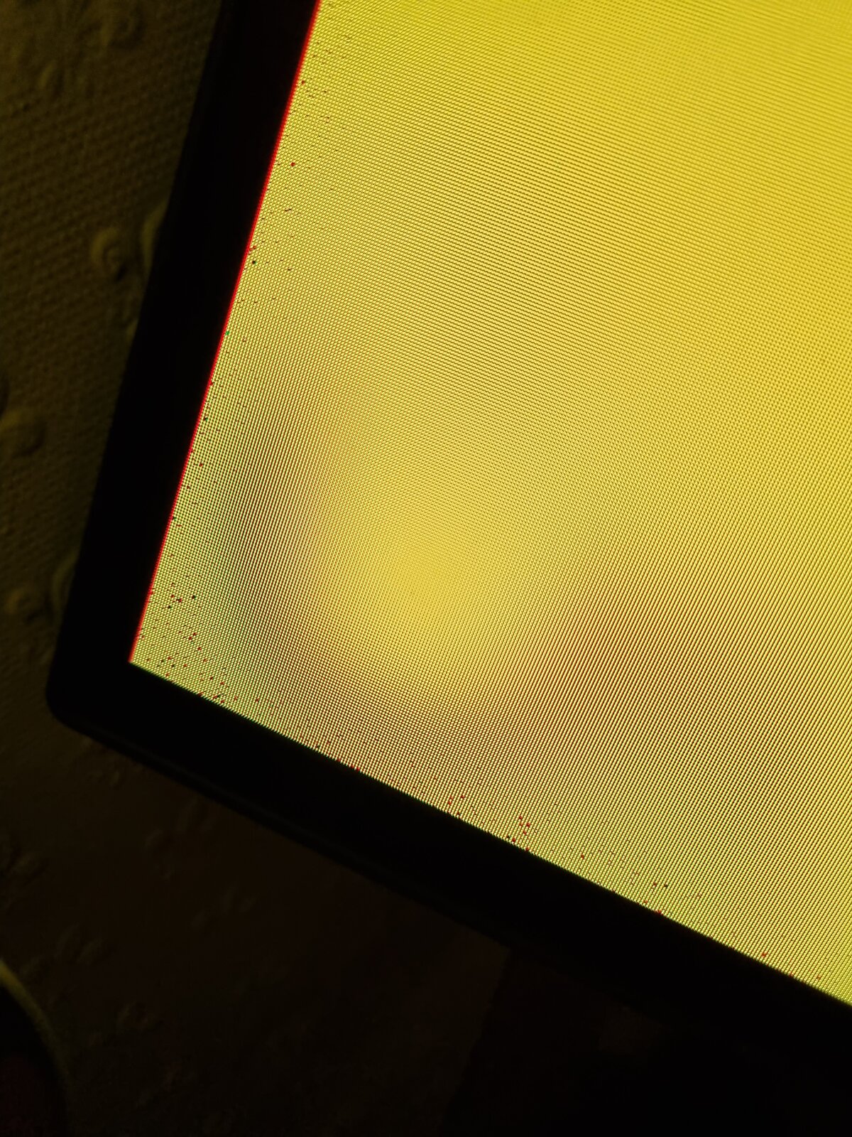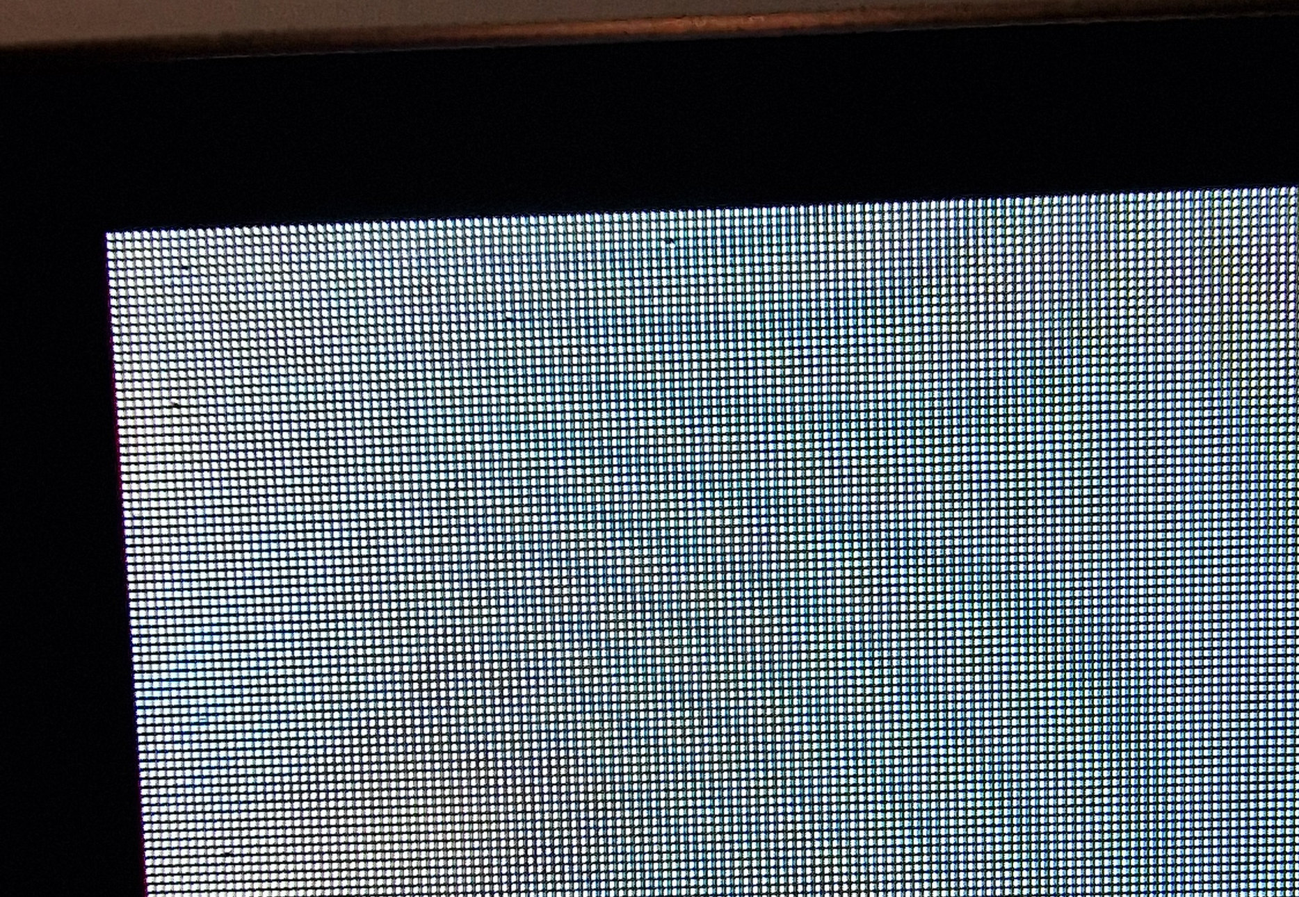 Я не слишком беспокоюсь, так как сижу достаточно далеко, чтобы это не было заметно. Это заметно на желтом, фиолетовом и синем цветах. Она проходит по всей верхней и нижней части экрана, но в центре дисплея нет ни одного застревающего пикселя.