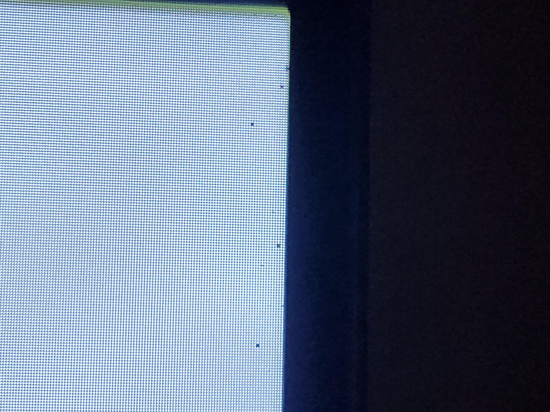 У меня сотни мертвых пикселей вдоль левой стороны экрана, а также в верхних и нижних углах. Я уверен, что весь нижний ряд пикселей на панели также полностью мертв, за исключением нескольких.