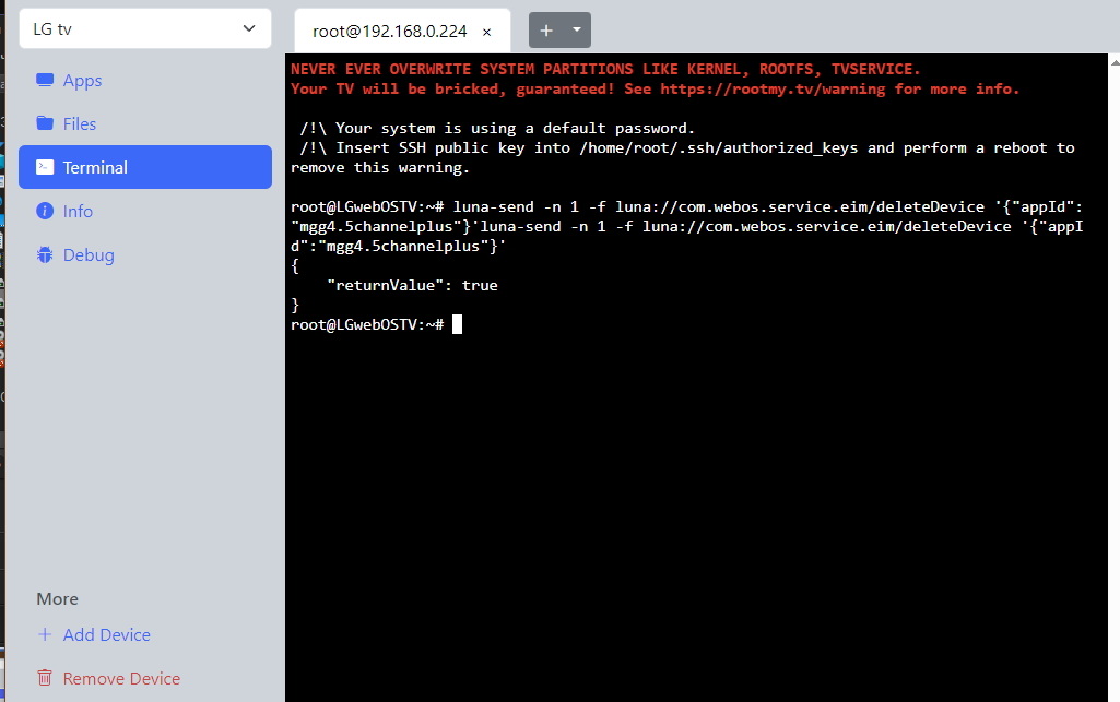 luna-send -n 1 -f luna://com.webos.service.eim/deleteDevice '{"appId":"mgg4.5channelplus"}'