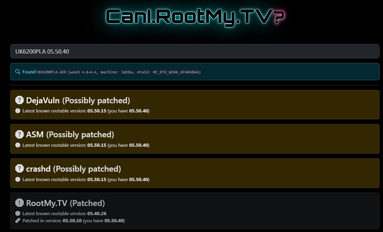 Добрый вечер, простите если глупый вопрос но если я запущу "dejavuln-autoroot-0.0.6.zip" на не рутированном ранее телевизоре LG UK6200PLA (os 05.50.40) есть шанс что он сломается? ) или какой-то из этих версий? https://github.com/throwaway96/dejavuln-autoroot/releases страшно, никогда раньше не запускала ничего на телевизоре