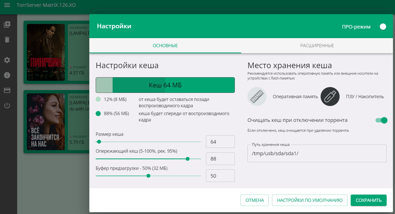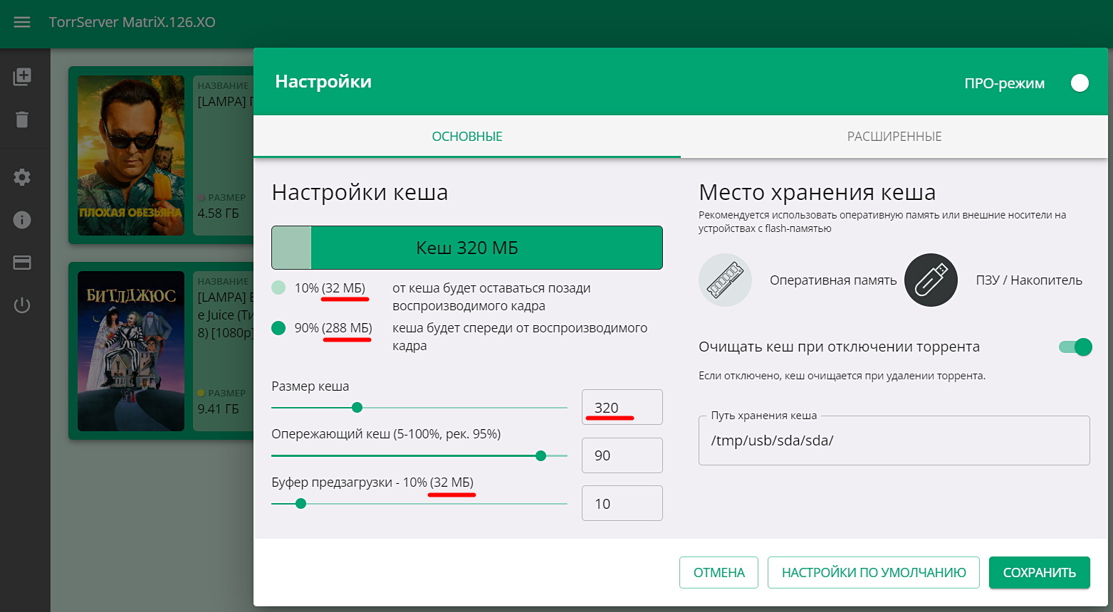 Настроил в TorrServer-е кэш на "ПЗУ/Накопитель": /tmp/usb/sda/sda1/
