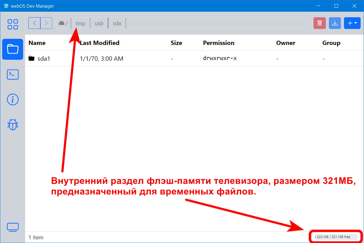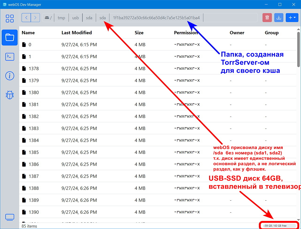 webOS присвоила USB-SSD диску имя sda без номера, т.к. на диске только один основной раздел, а не логический, как у флэшек (sda1).