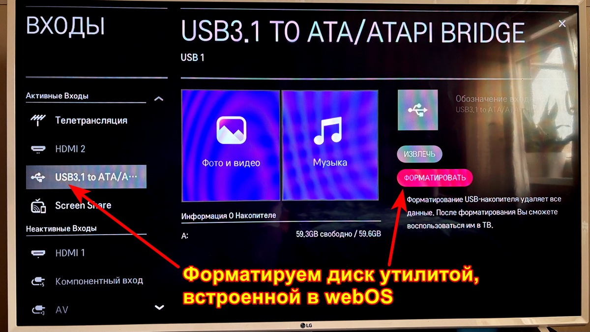 Вставил в телевизор и отформатировал диск утилитой, встроенной в webOS.