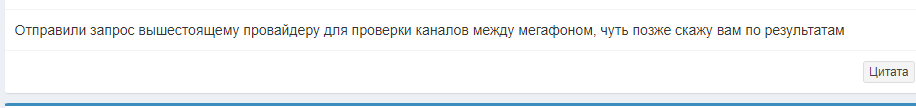 wwwtv писал(а):Есть у вас общее - у обоих к нам трасса приходит через Мегафон, у нас есть подключение к Мегафону. Но у нас этот канал с запасом, перегруза нет. А у вас прям каждый вечер проблемы или бывают дни, когда нормально работает? Если такие бывают, напишите какие, я посмотрю с нашей стороны загрузку канала.