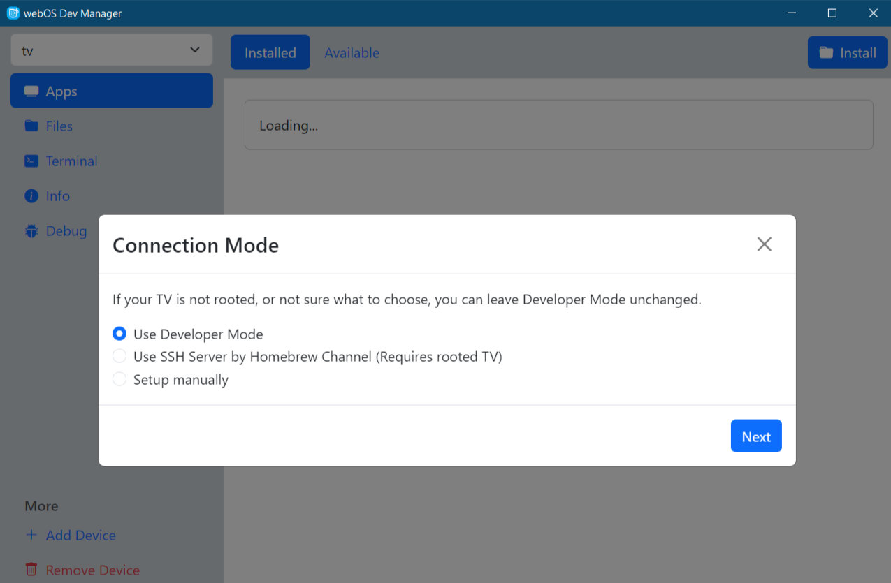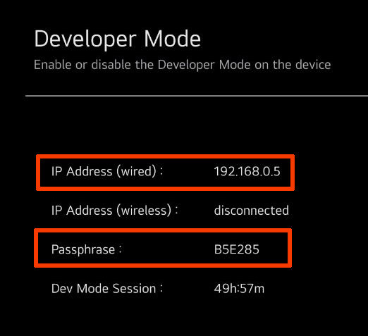- "Address" (введите IP address, найти его можно в приложении "Developer Mode" на телевизоре) ;