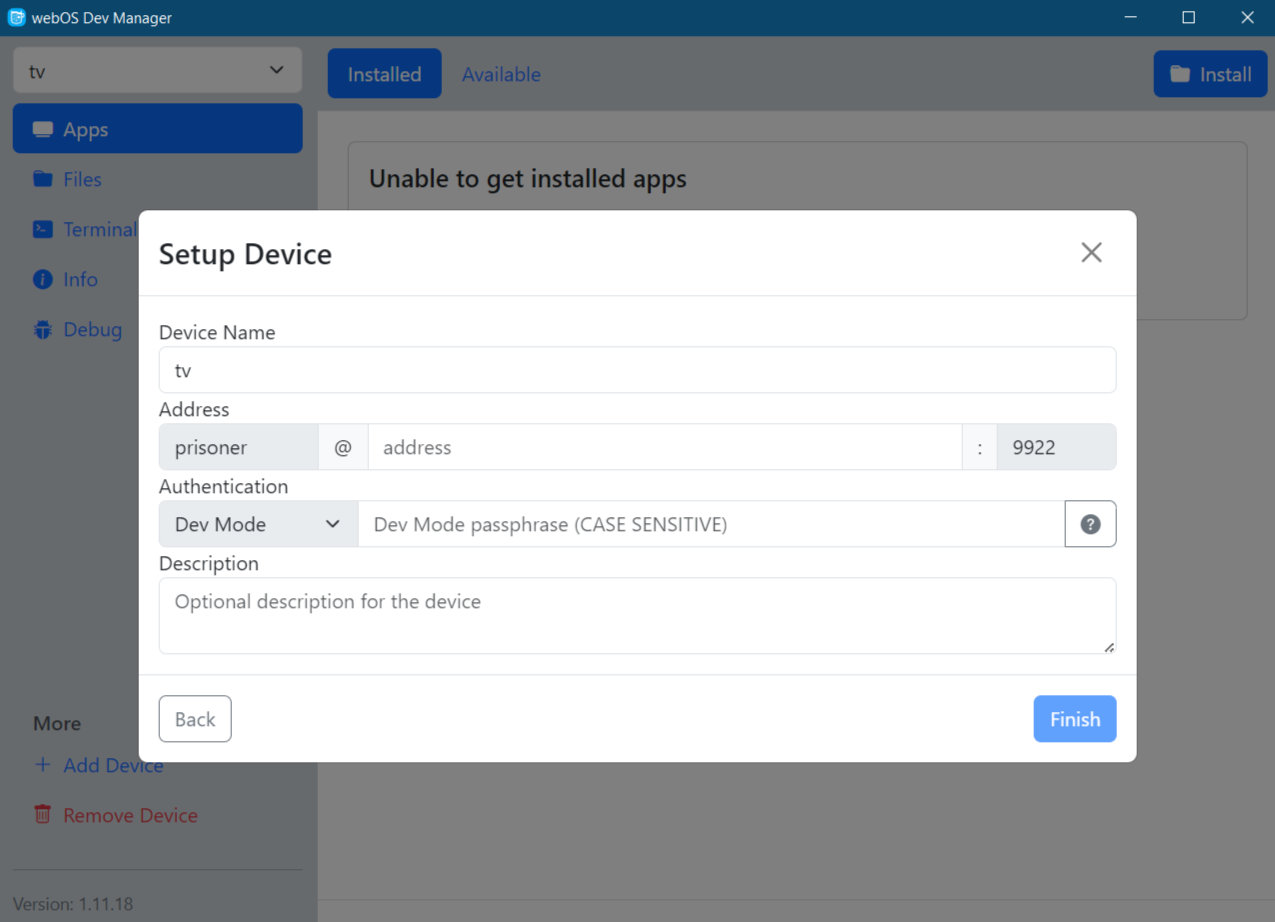 - "Dev Mode passphrase" (введите Passphrase, найти его можно в приложении "Developer Mode" на телевизоре) - Нажмите "Finish".