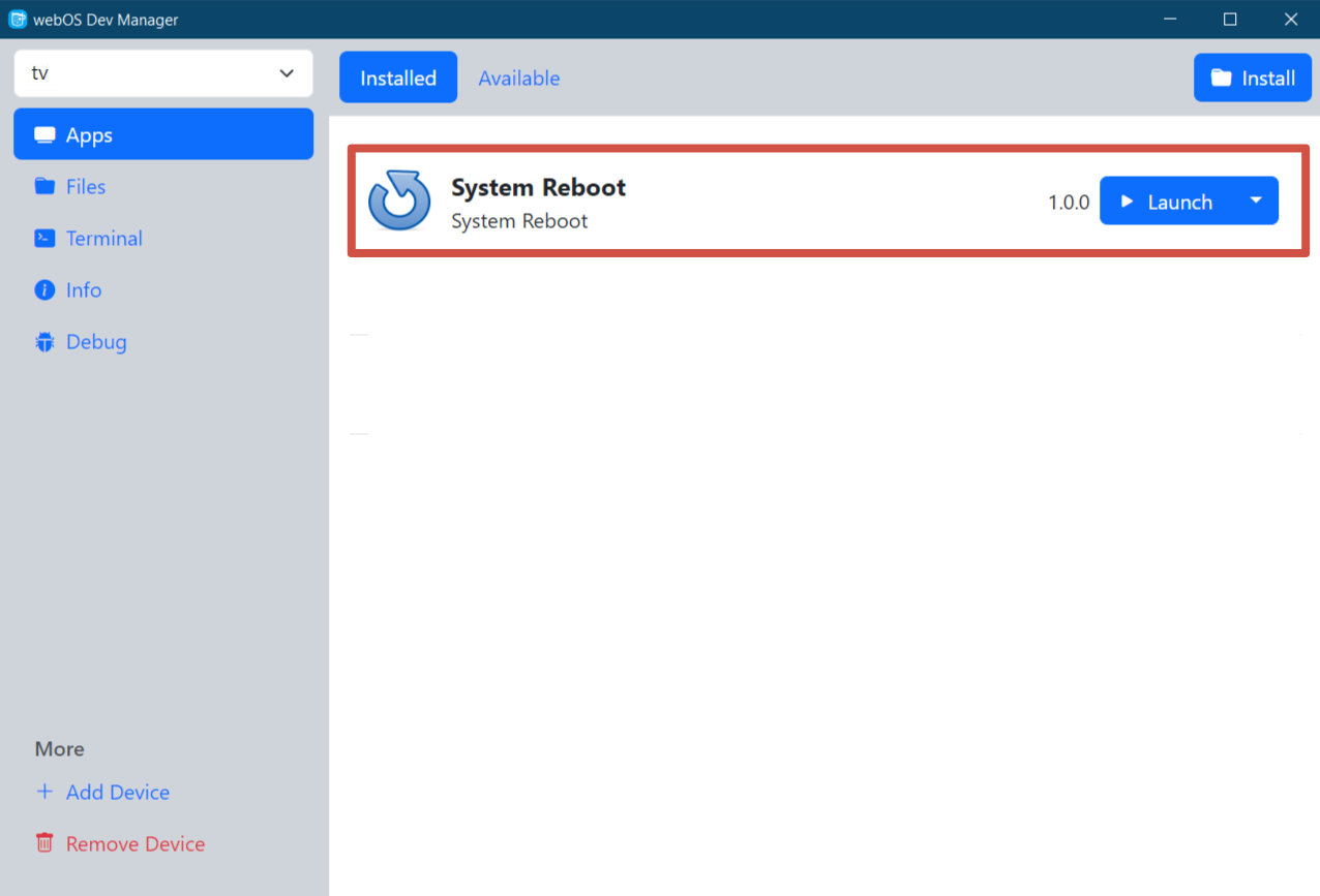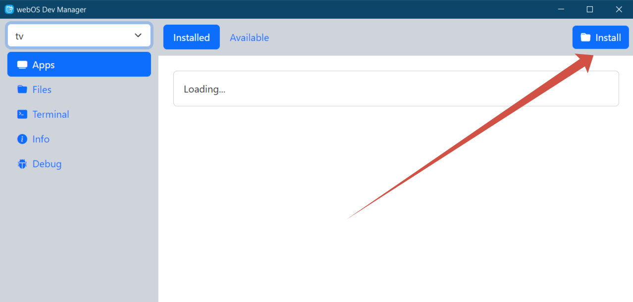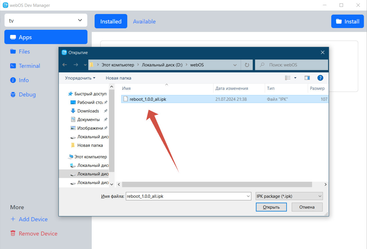 - Нажмите "Install", добавьте ipk-файл приложения и дождитесь его загрузки в телевизор: