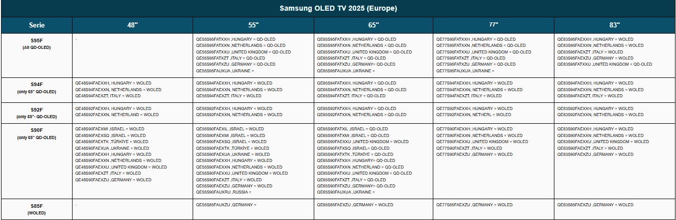 В частности, в базе данных запчастей есть модели «QE83S95FATXXU» и «QE83S95FAEXXU». Первая строка кода, очевидно, относится к размеру и модели телевизора, а последняя строка букв, в данном случае «FAT» и «FAE», соответствует типу матрицы. Вышеупомянутый пользователь Reddit утверждает, что FAT означает QD-OLED, а FAE — WOLED.