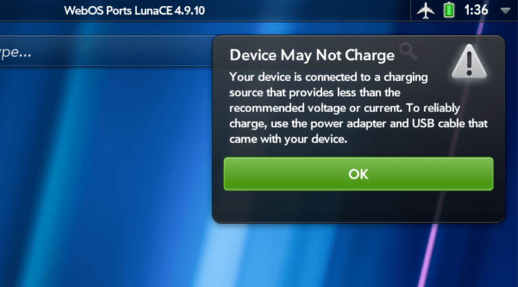 Можно с уверенностью сказать, что в мире осталось больше планшетов HP TouchPad, чем оригинальных зарядных устройств к ним. Это означает, что если у вас сегодня есть TouchPad, то вы, скорее всего, используете TouchStone, компьютер или любое другое зарядное USB-устройство (очень медленное) для зарядки вашего девайса 13-летней давности. Также это означает, что вы наблюдаете сообщение об ошибке каждый раз, когда подключаете его к чему-либо, кроме оригинального зарядного устройства в форме "бочонка" или компьютера.
