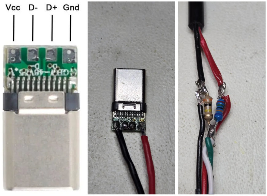 Если вы делаете кабель USB Type C - USB Type C, возьмите плату USB Type C, на которую была ссылку выше, и ваш 2-проводной кабель (или 4-проводной, с которого вы обрезали линии данных). Вам также придется отрезать конец, чтобы освободить место для нового разъема.