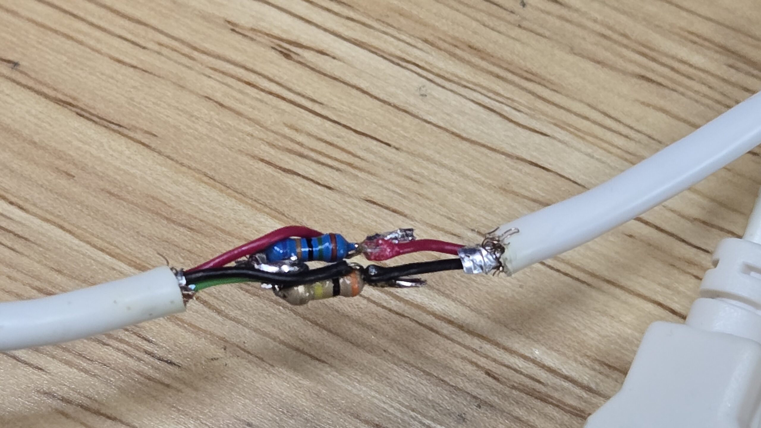Как расположить резисторы, смотрите на изображении ниже. Если вы делаете кабель USB A, разрежьте его на две части, отложите сторону USB A и возьмите micro или USB C для этой части. Неважно, как далеко от каждого конца вы отходите, это ваш выбор. Зачистите провода, чтобы у вас было достаточно оголенного провода для работы.