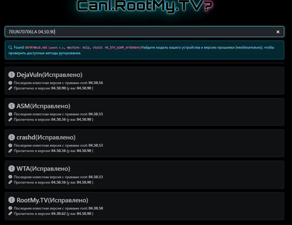 Так проверьте, как советуется в Voronoff @ [rootmy.tv] Как получить Root права на webOS и станет понятно, что все мимо уже для такой прошивки.bloodclod писал(а):70UN70706LA 04.50.90