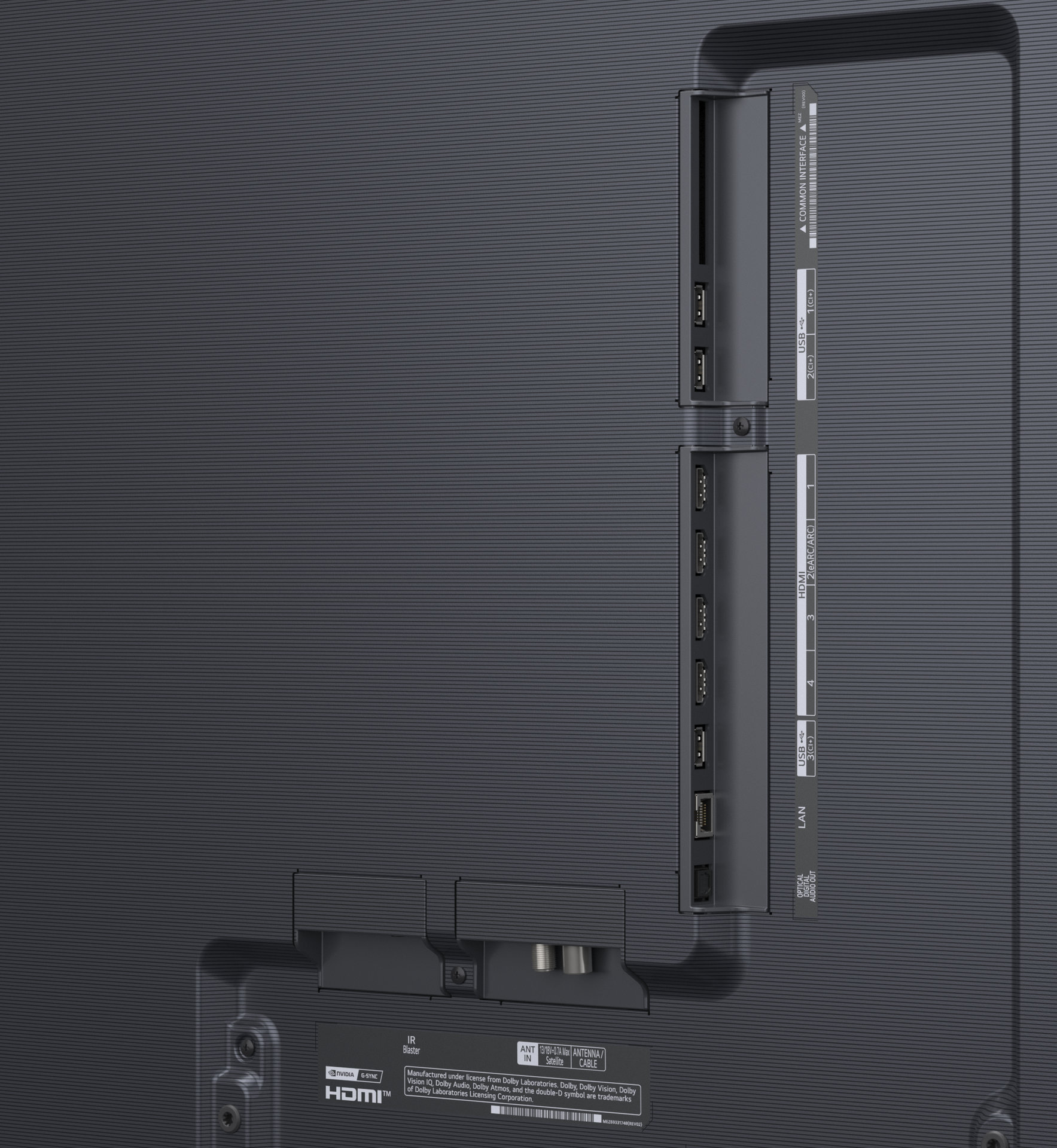 Нижняя панель оснащена двумя входами HDMI 2.1, двумя антенными входами (для спутникового и кабельного/эфирного ТВ), двумя портами USB 2.0, одним портом LAN (со скоростью 100 Мбит/сек) и портом ИК-передатчика. Что касается аудио, то на этой же панели расположен только оптический аудиовыход, выход 3,5" на наушники/акустику отсутствует.