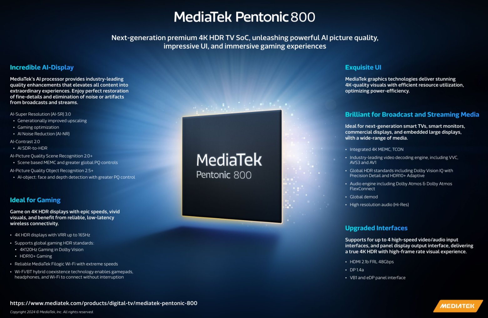 MediaTek Pentonic 800 представляет собой премиальный SoC для 4K телевизоров, который обеспечивает высокое качество видео и аудио, а также отличные игровые возможности при использовании дисплеев с переменной частотой обновления (VRR) до 165 Гц.